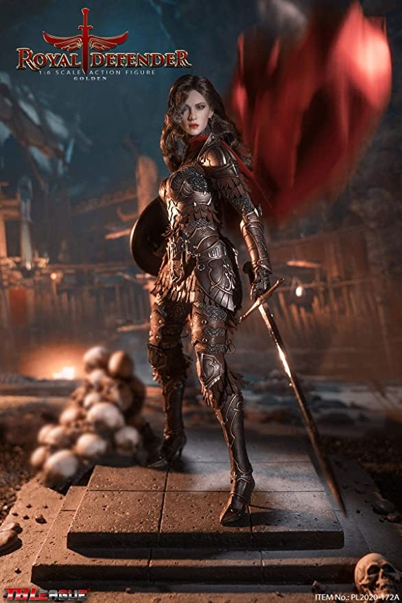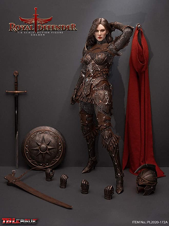 The Dark Knight reads from a letter sent from the front that the evil enemy is playing back. They face another fierce battle, but with an unbreakable faith in the protection of the realm and the people, the Royal Guard is ready! Packing List: 01) 1 x Head Sculpture02) 1 x TBLeague 1/6 Female None Sewn Body with Metal Frame03) 1 x Bodysuit04) 6 x Interchangeable Hand Gloves05) 1 x Neck Armor06) 1 x Leather Shoulder Armor07) 1 x Waist Armor08) 1 x forearm08 9) 1 x breast armor10) 1 x leather skirt11) 1 pair x heels12) 1 pair x knee pads13) 1 x helmet14) 1 x cape15) 1 x shield16) 1 x sword17) 1 x Sheath Packing: 1 Product/Separate Box GW: 1.37kg Dimensions: 24.3cm*9cm*38cm