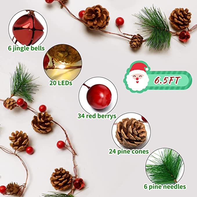 Christmas Garland with Fairy Lights 6.5FT 20 LED Battery Operated Lighted Xmas Garland Pine Cones Pre Lit Garland Christmas Home Decor for Mantle Stairs Tree Fireplace Table Indoor Outdoor Decoration