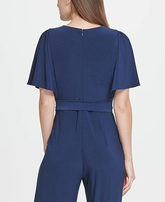 DKNY Women's Navy Tie Solid Short Sleeve V Neck Wrap Boots Cut Work Jumpsuit Size 2