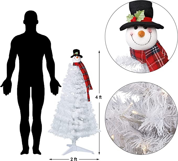 Package Includes: 1 x White Christmas Tree, 1 x Snowman Tree Topper, 3 x Plastic Tree Stand